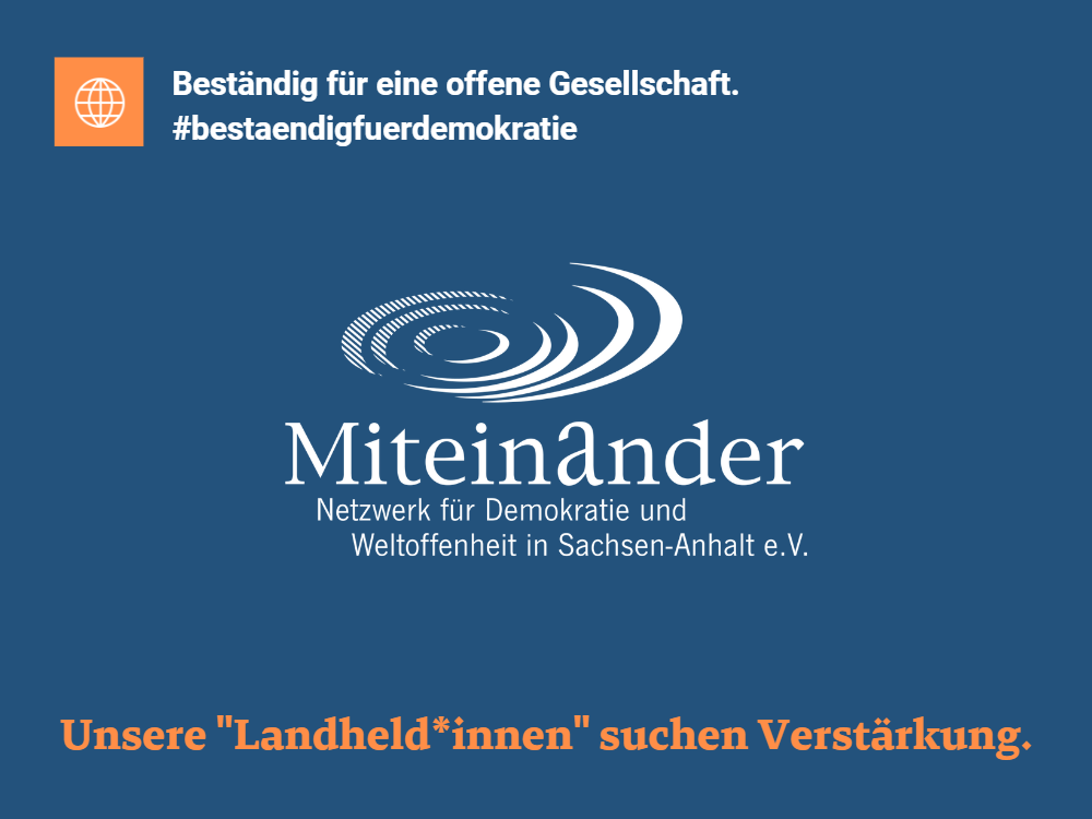 Miteinander e.V. sucht für seine Bildungsarbeit im Modellprojekt „Landheld*innen. Für eine demokratische Alltagskultur in der Nachbarschaft“ eine*n Referent*in. Zum nächstmöglichen Zeitpunkt ist eine Stelle in Vollzeit mit 40 Wochenstunden oder in Teilzeit zu besetzen. Der Arbeitsort ist Salzwedel. Die Vergütung erfolgt in Anlehnung an TV-L EG 10. Die Stelle ist bis zum 31.12.2024 befristet. Eine Weiterbeschäftigung über den 31.12.2024 hinaus wird angestrebt. Ihre vollständigen und aussagekräftigen Bewerbungsunterlagen senden Sie bitte bis zum 15.05.2023 ausschließlich per E-Mail an: bewerbung@miteinander-ev.de.
